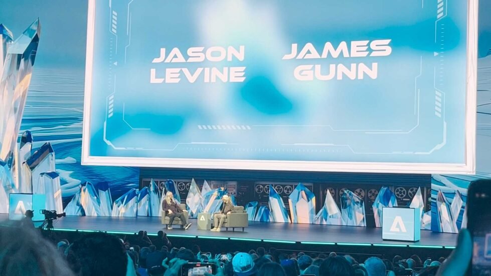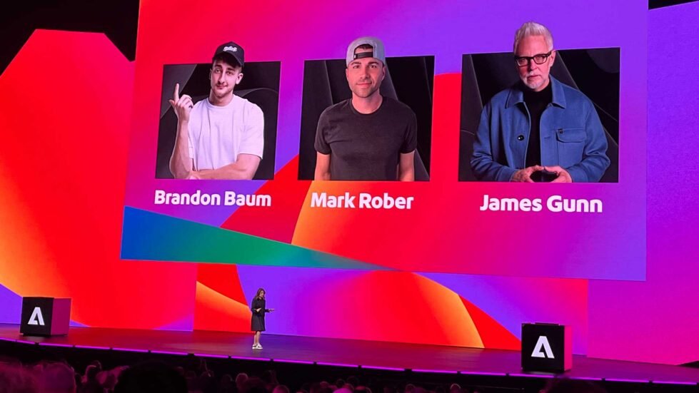 La gran postal del nuevo mundo creativo se dio en el Peacock Theatre (7.100 butacas repletas) cuando Adobe subió al escenario a James Gunn, director de Guardianes de la Galaxia, Peacemaker y la nueva Superman, solo después de dos youtubers gigantes: Brandon Baum (@heyBrandonB, 16,2M) y Mark Rober (@MarkRober, 71,7M). Hollywood y YouTube compartiendo el mismo keynote. Un signo clarísimo de esta época.